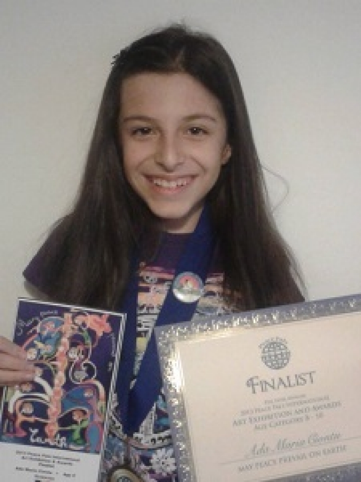 A 10 éves Ada Ciontu munkáját a nemzetközi zsűri harmadik alkalommal választotta ki több ezer pályaműből a húsz legjobb, döntős alkotás közé a Béke Barátai rajzversenyén.