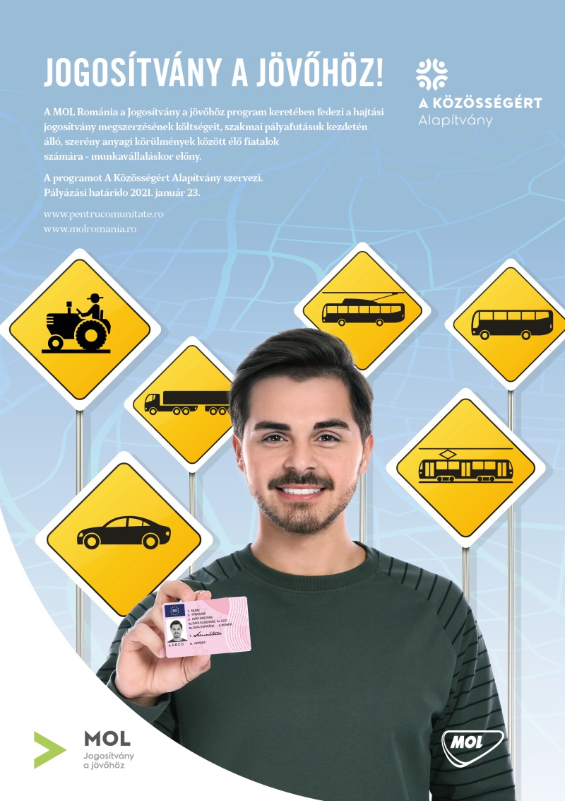 A Jogosítvány a jövőhöz programot A Közösségért Alapítvány szervezi a MOL Románia által rendelkezésre bocsátott pénzalapból. A program anyagi támogatást biztosít 17-25 éves, hátrányos helyzetű fiatalok részére, B, C, D kategóriájú, beleértve traktor, trolibusz és villamos, gépjárművezetői engedély költségeinek fedezéséhez, akik számára a hajtási engedély feltétel vagy előny a munkavállalásnál, vagy hasznos eszköz a munkaköri teendők ellátásában azoknak, akik már dolgoznak.